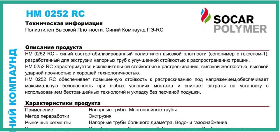Компания SOCAR POLYMER сообщила о разработке и начале производства новой специальной марки Полиэтилена Высокой Плотности HM 0252 RC (PE-RC).