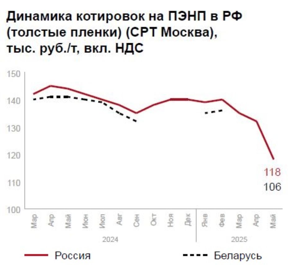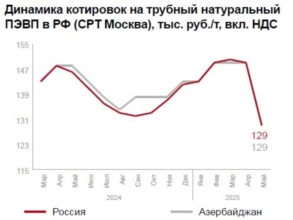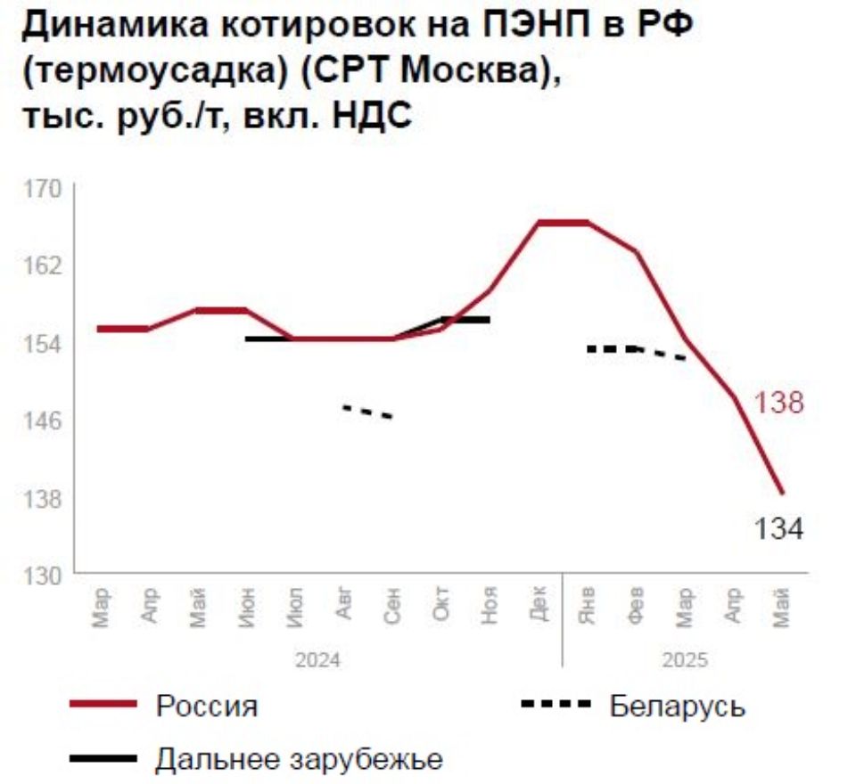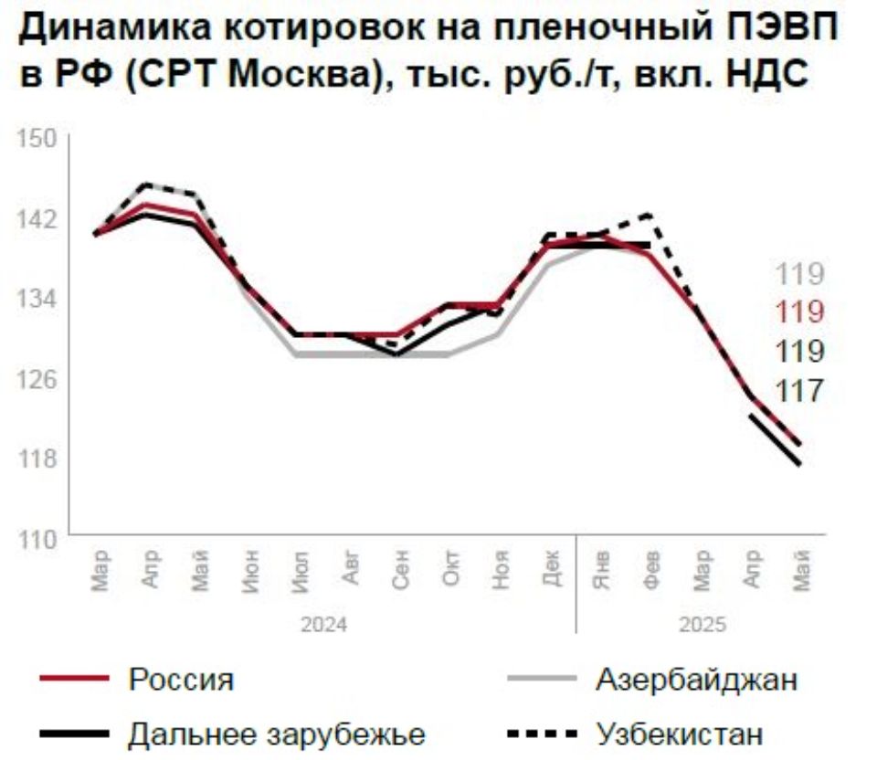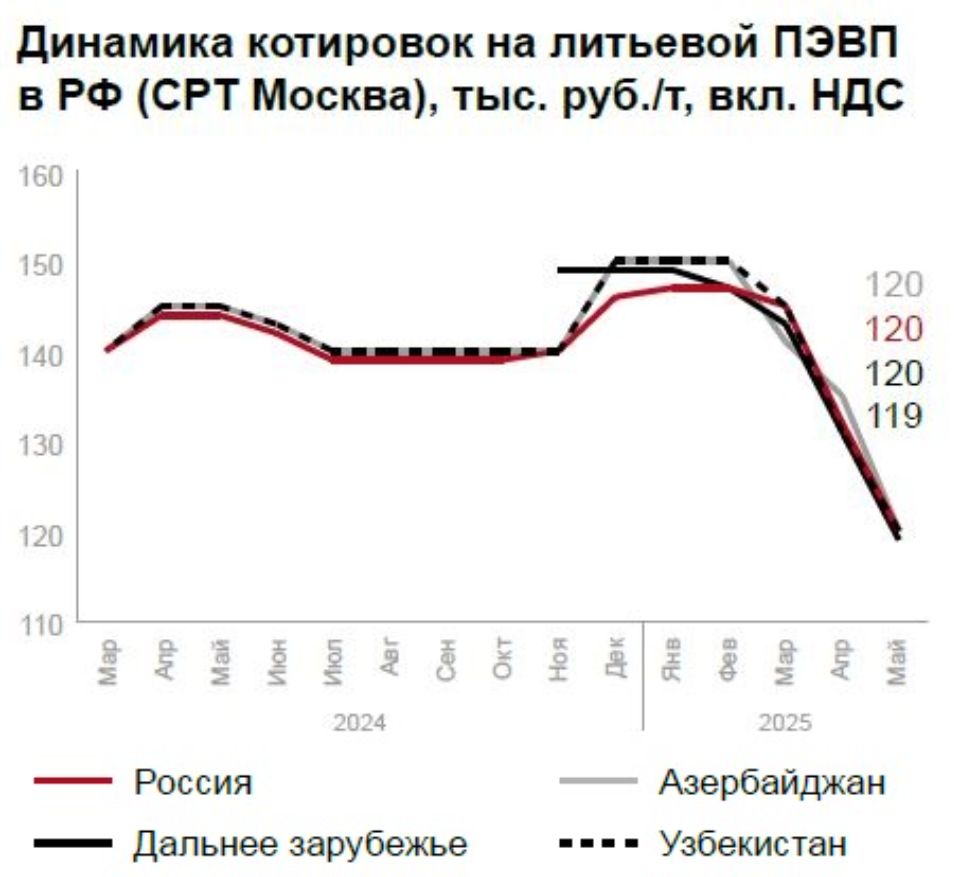 В сегменте ПЭВП отмечается ценовая стабильность при слабом импортном спросе (иранский CRP100 N - 117 500 руб./т). Ожидается сезонный рост в строительстве и упаковке, хотя до прошлогодних показателей рынку пока далеко.