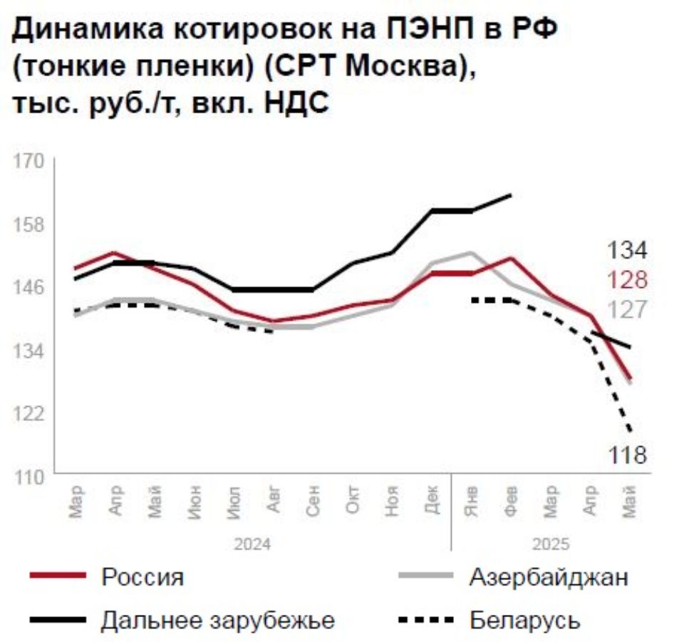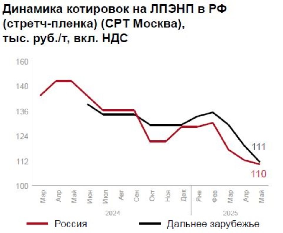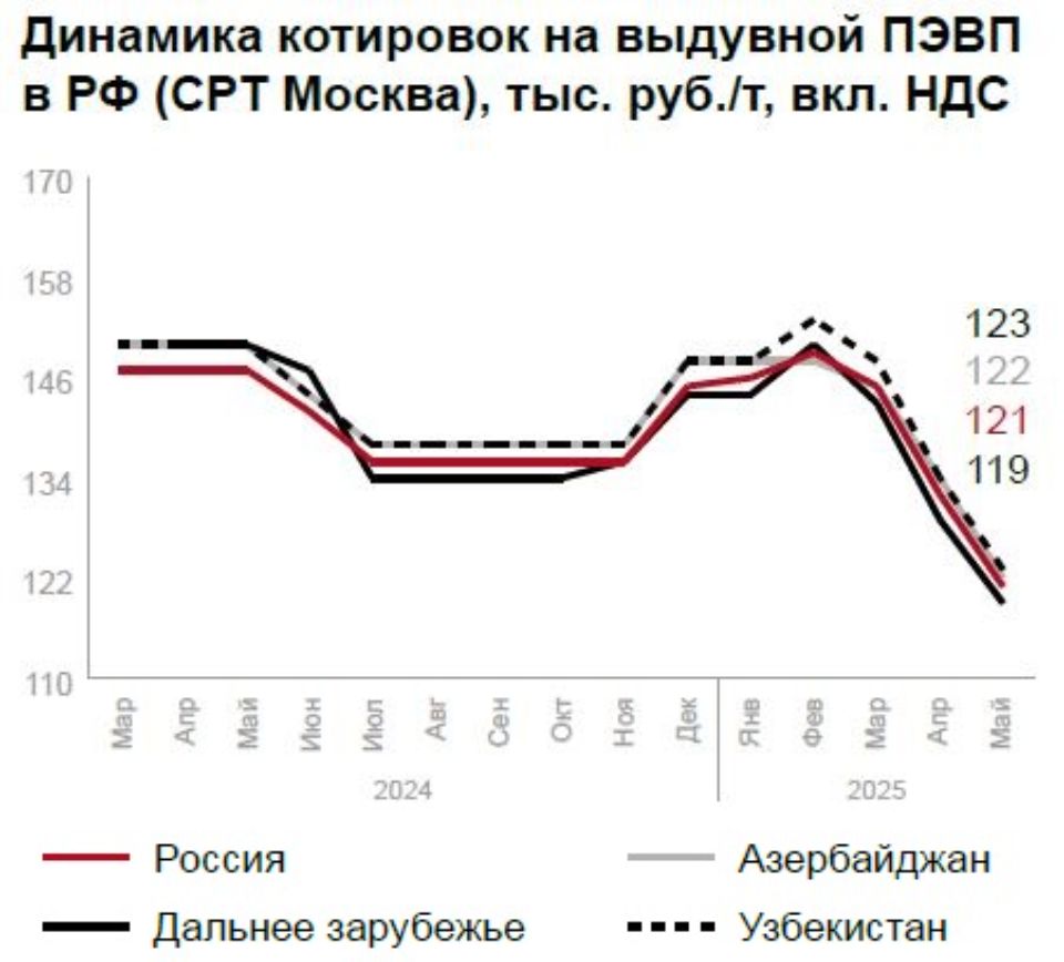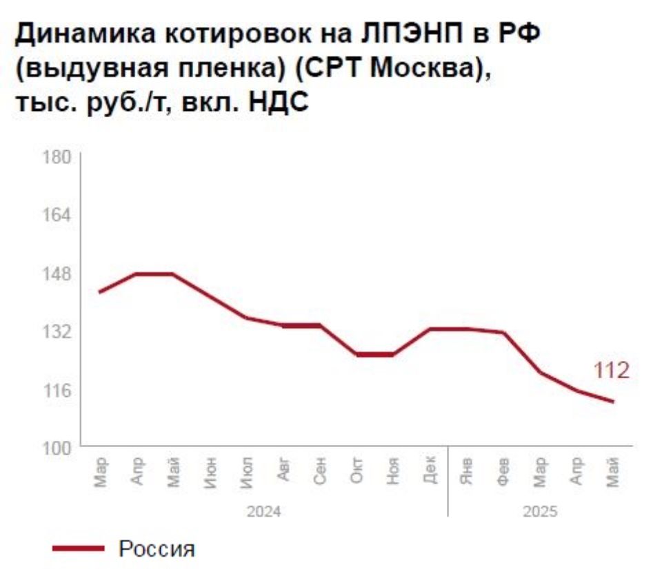 В сегменте ПЭВП отмечается ценовая стабильность при слабом импортном спросе (иранский CRP100 N - 117 500 руб./т). Ожидается сезонный рост в строительстве и упаковке, хотя до прошлогодних показателей рынку пока далеко.