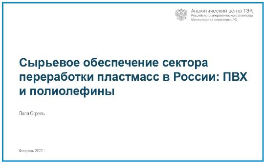 Сырьевое обеспечение сектора переработки пластмасс РФ Директор "Аналитический центр ТЭК" Министерство энергетики РФЗапросить доклад в видеоформате >> докладчик: Лола Давлатовна Огрель