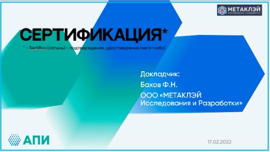 Сертификация Начальник отдела химического анализа ООО "МЕТАКЛЭЙ Исследования и Разработки" докладчик: Федор Николаевич Бахов