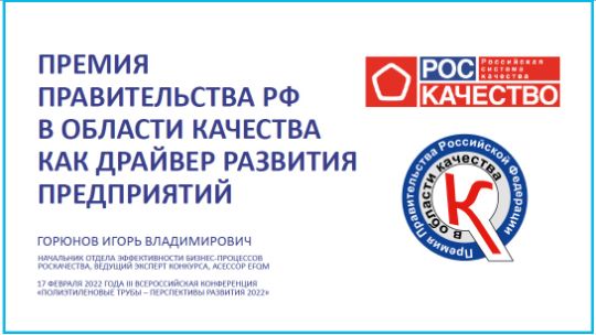 Премия Правительства РФ в области качества как драйвер развития предприятий Начальник отдела эффективности бизнес процессов Роскачества, ведущий эксперт конкурса, АСЕССОР EFQM докладчик: Игорь Владимирович Горюнов
