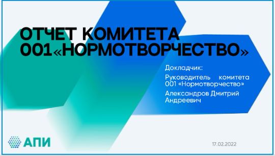 Отчетный доклад комитета 001 "Нормотворчество" Вице-президент АПИ Руководитель комитета 001 "Нормотворчество" докладчик: Дмитрий Андреевич Александров
