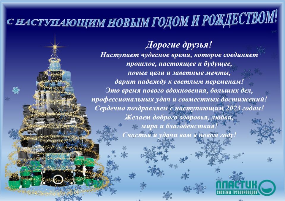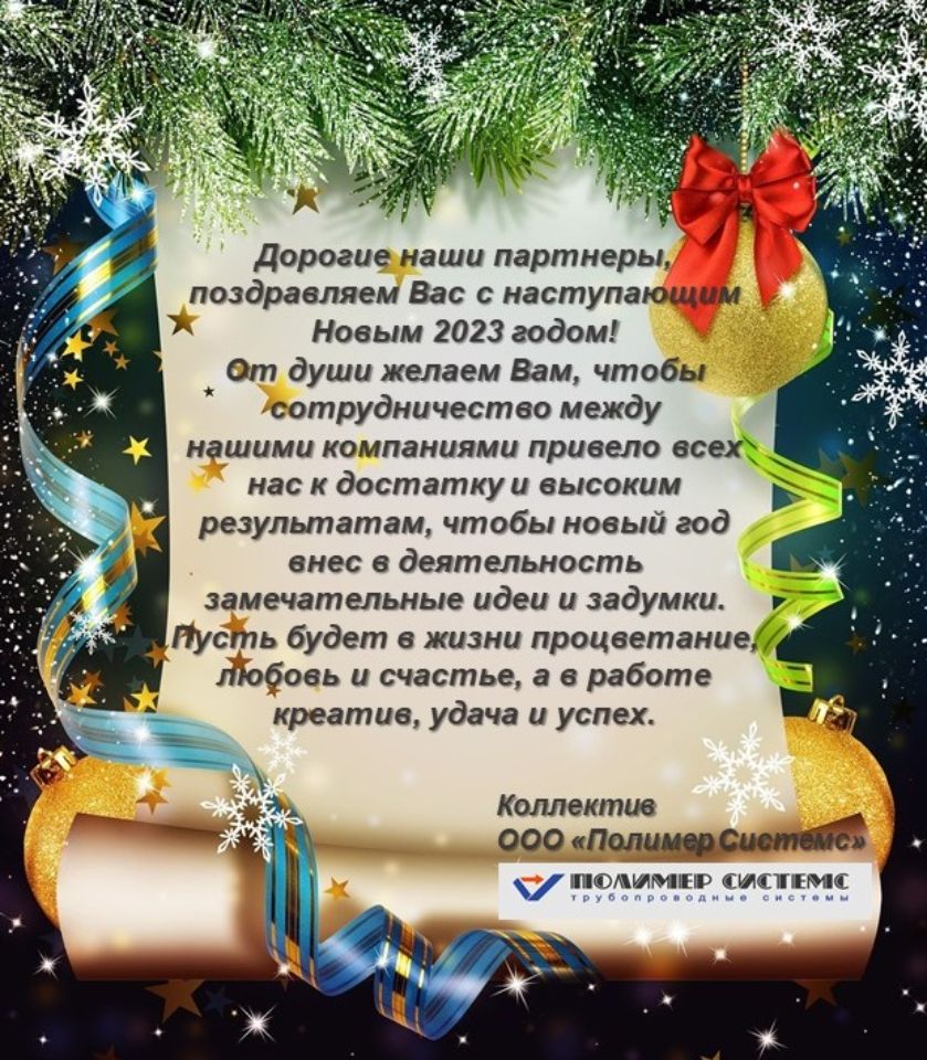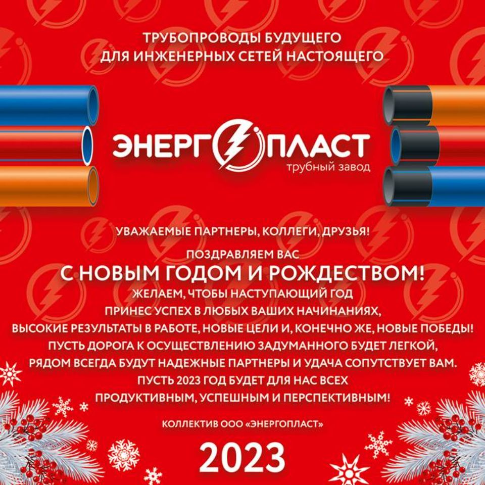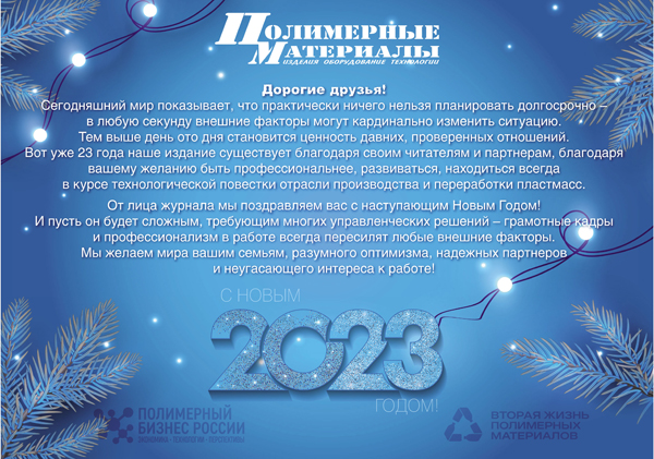 Ассоциация Полимерной Интеграции (АПИ) получила большое количество поздравлений с наступающим Новым 2023 годом и Рождеством от партнеров и коллег полимерной отрасли: ООО "ТЕХСТРОЙ", АО "ГИПРОНИИГАЗ", ООО "ИНГК-ПРОМТЕХ", ООО "ЭНЕРГОПЛАСТ", ООО "МПТ", ПО "Квант", ООО "Политэк Пайп", ООО "Тверьтрубпласт", Национальная ассоциация водоснабжения и водоотведения, ООО "Ольмакс", НПК "ЭНЕРГОПЛАСТ" , ГК "Полимерные композиты", ООО "ПКП ВТОРМА", компания APE, ООО "ТЕХНОСТРОЙГРУПП СЕРВИС", ООО "Ремгазкоммуникации", компания ADL, ГК "CTF", ООО " Полимер Системс", завод "FDplast", АО "Метаклэй", редакция журнала "Полимерные материалы", Российский союз химиков, Ассоциация производителей газового оборудования, ООО "Алиаксис инфраструктура и промышленность", ООО "Ариэль Пласткомплект", ООО "Парк РФМ", научно-производственная фирма "Политехника".