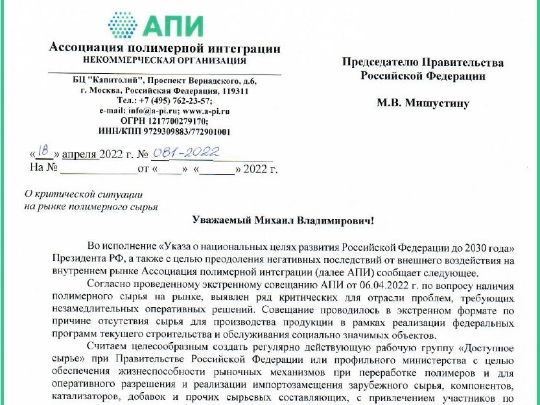 В результате проведенного совещания было принято решение о создании регулярно действующей рабочей группы "Доступное сырье" с целью обеспечения жизнеспособности рыночных механизмов при переработке полимеров и для оперативного разрешения и реализации импортозамещения зарубежного сырья, компонентов, катализаторов, добавок и прочих сырьевых составляющих с привлечением участников по следующему принципу: профильные ассоциации (Совет профильных ассоциаций – СПА) и другие заинтересованные ассоциации и союзы, производители сырья, производители полимерной продукции, потребители, а контролирующую функцию оставить за представителями уполномоченных государственных структур.